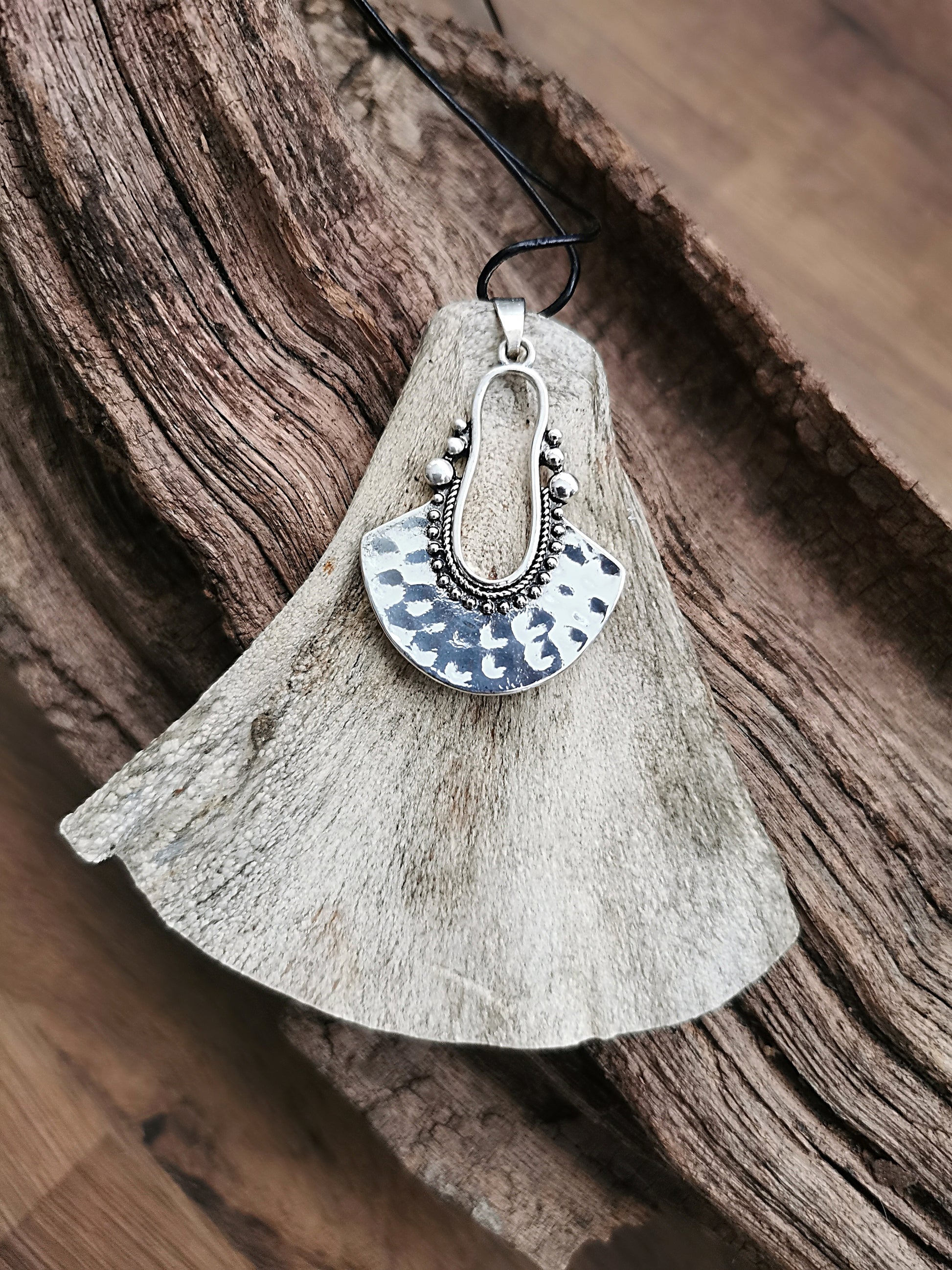 Handcrafted from ethically sourced horse leather, reclaimed in the spirit of respect and renewal, this piece embodies both wild instinct and steady resilience. Suspended on a natural leather cord and adorned with a silver-toned metal detail, it brings together the raw earthiness of the animal realm with the quiet elegance of elemental metal – a union of matter and spirit.