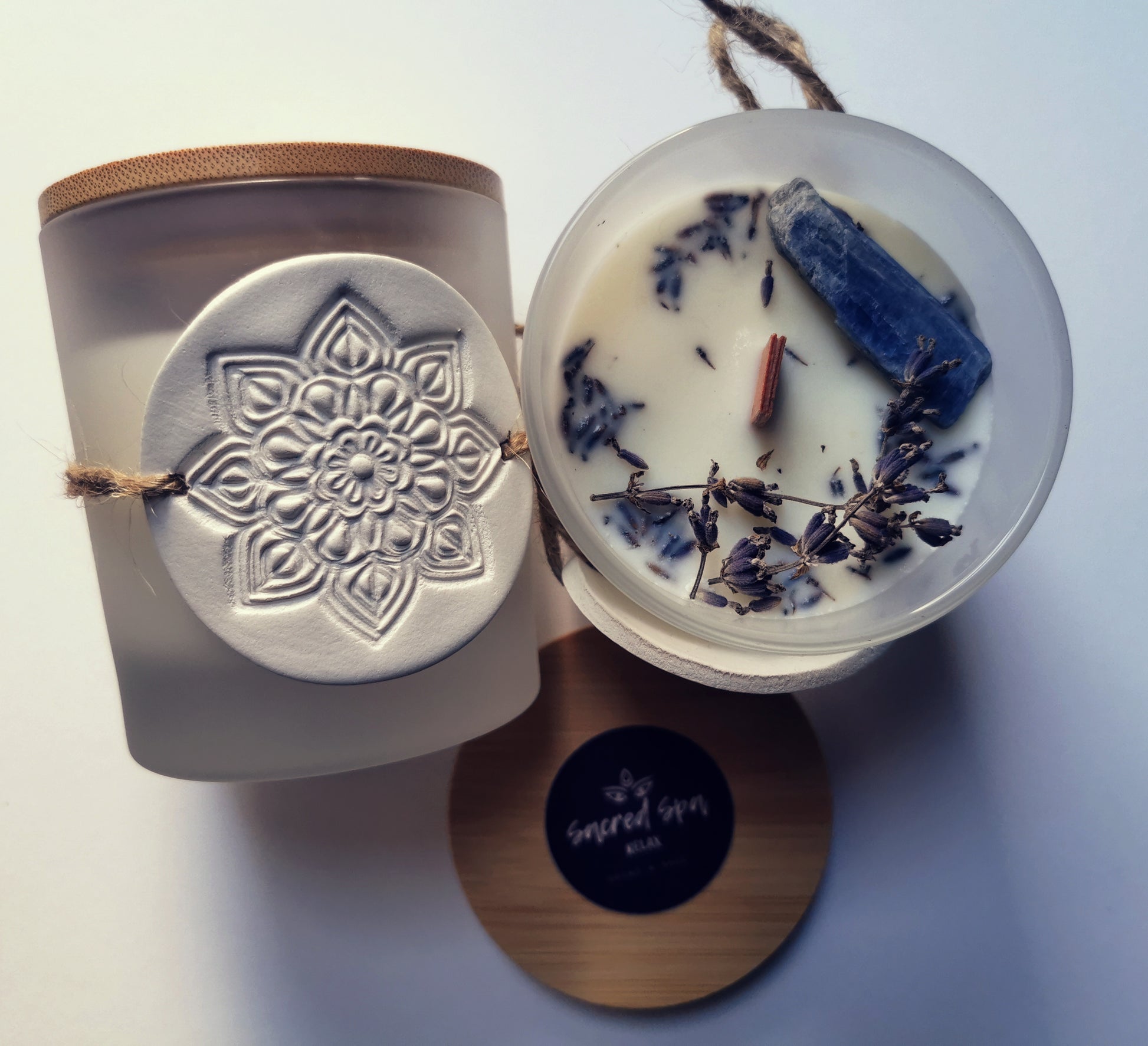 Hand-poured with natural soy wax in a 30cl / 300ml glass jar, the RELAX candle features a wooden wick that crackles softly, echoing the soothing rhythm of nature. Each candle is lovingly handcrafted in small batches, topped with dried lavender flowers – a timeless symbol of peace, rest, and emotional healing. Hidden within the wax rests a Blue Kyanite crystal – known for aligning the chakras, clearing emotional blockages, and supporting deep meditation and authentic communication.